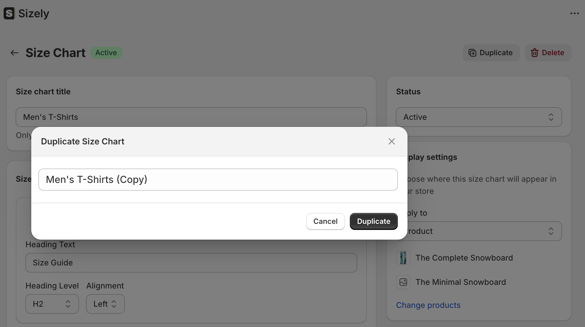 Duplicating a size chart creates an exact copy with all the same content and modules, allowing you to quickly create variations or use an existing chart as a starting point for a new one.