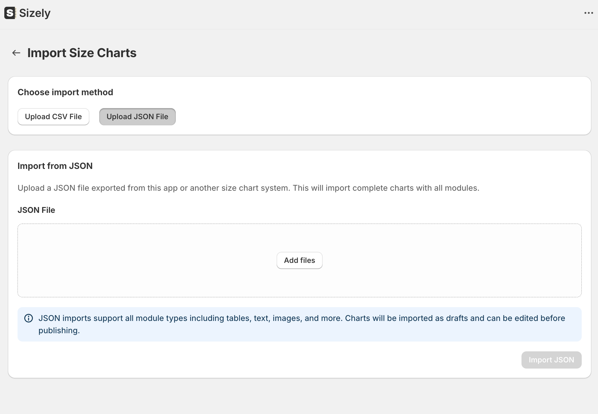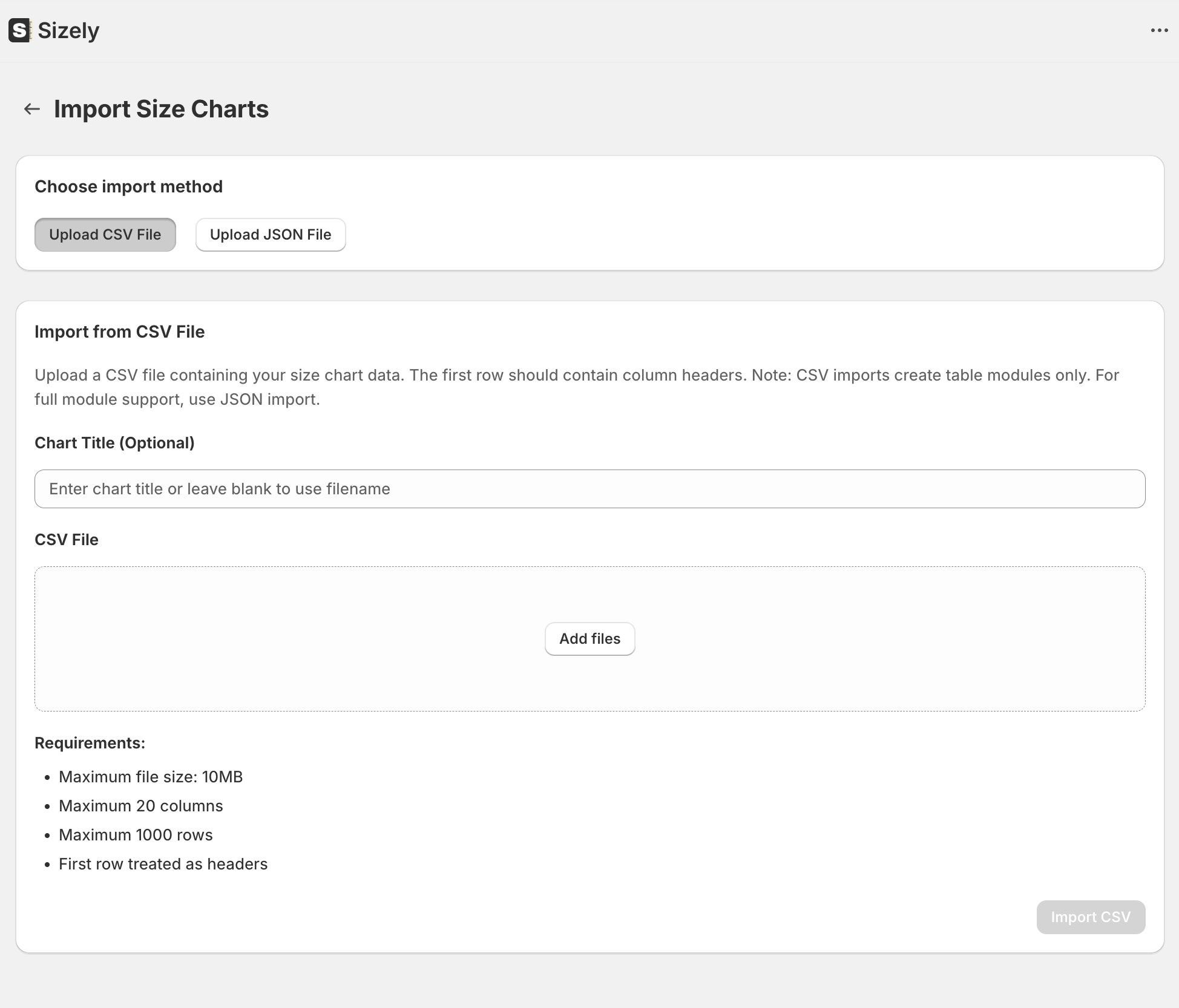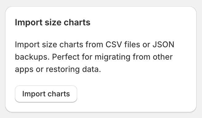 Import existing size charts to quickly add sizing data to your store. You can import from CSV files or previously exported JSON files.
