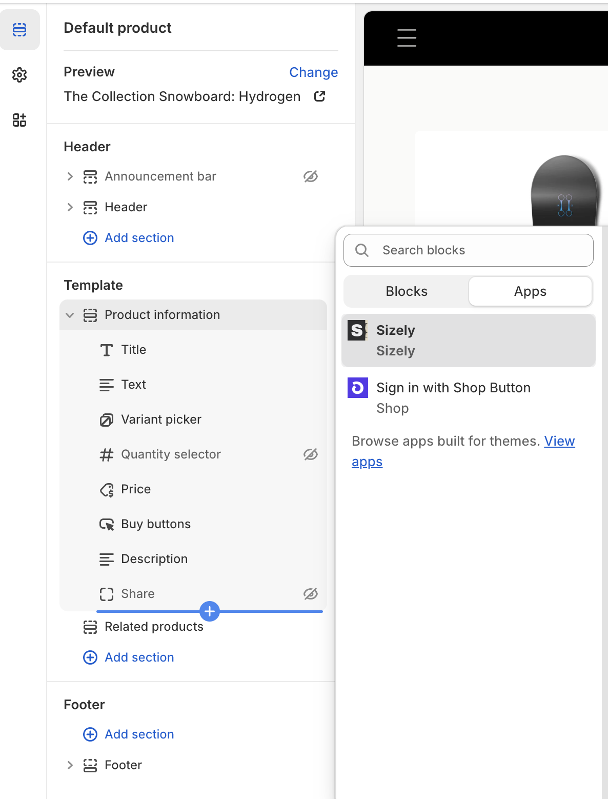 - Verify app block: Confirm the Sizely app block is added and enabled